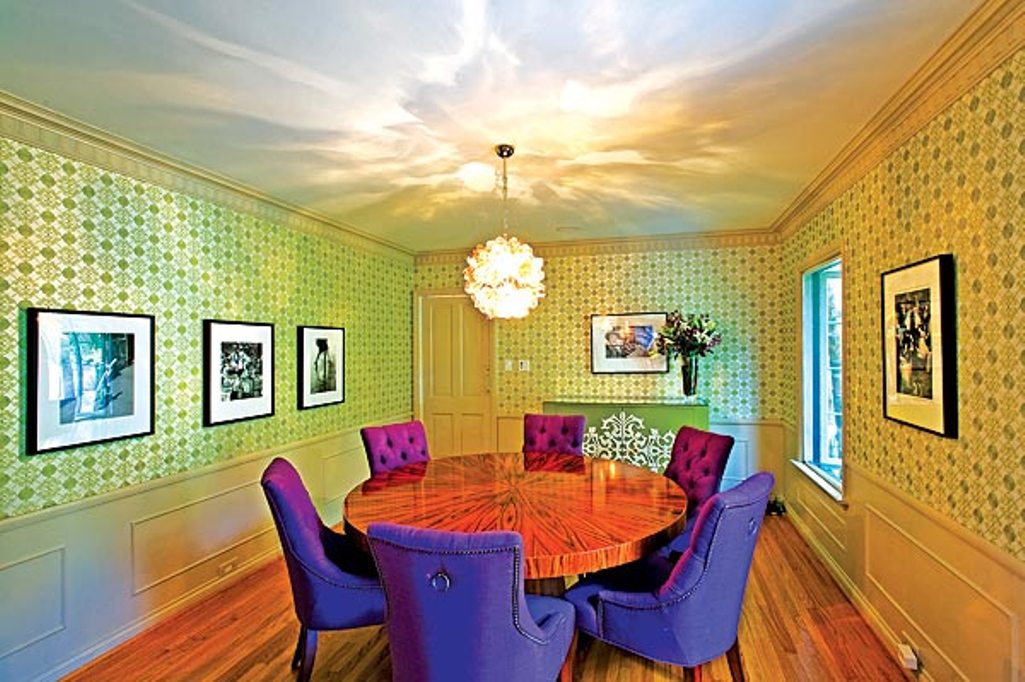 Furniture, lighting and kitchen 90 I The master bedroom features a luxurious leather headboard and quirky finds. such as chairs from Tiger Stadium. a director's chair used as a nightstand. and pillows With a crown motif Drama reigns in the dining room. A table made from glass. wood and ... Content Retrieval